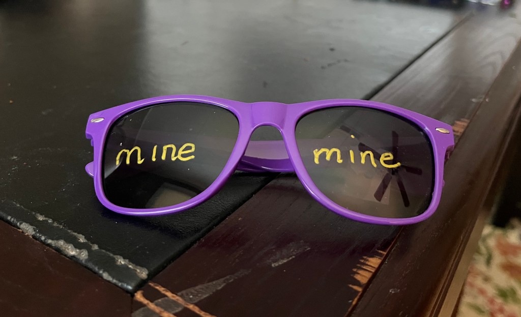 Finding an age-appropriate vehicle to make my point became a quest. One day, I noticed a pair of my daughter’s children’s sunglasses lying around and had an idea. I found a gold marker because every children’s minister has every color of marker, especially shiny ones. On those child-sized sunglasses, I wrote MINE on each lens. That Sunday morning, I showed them the glasses, had each child put them on, and tell me what they saw.